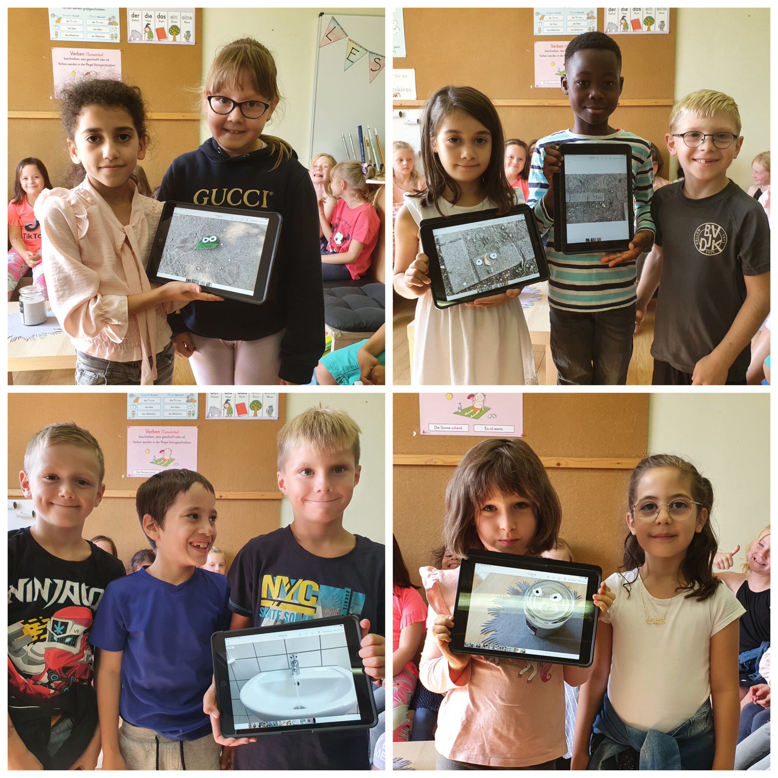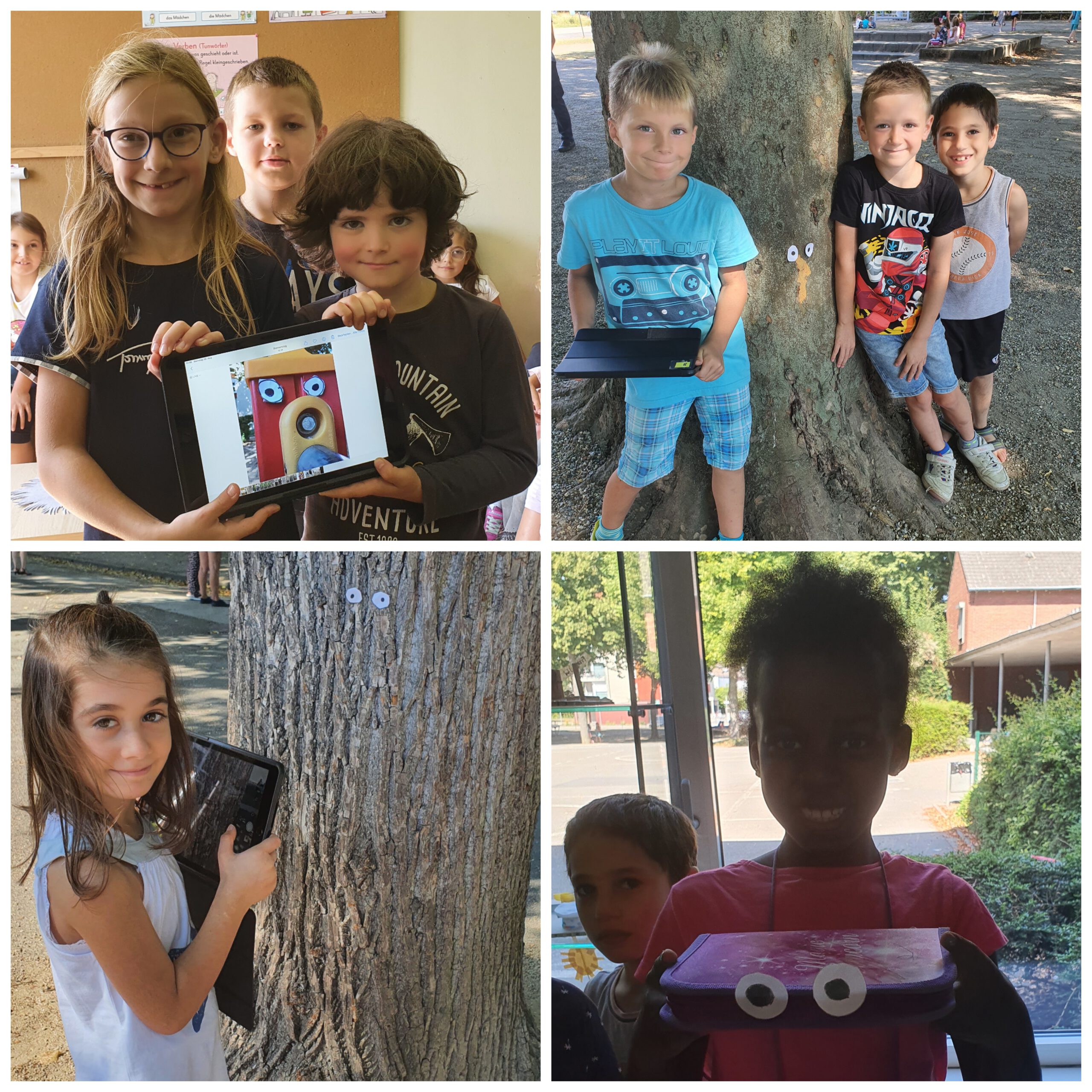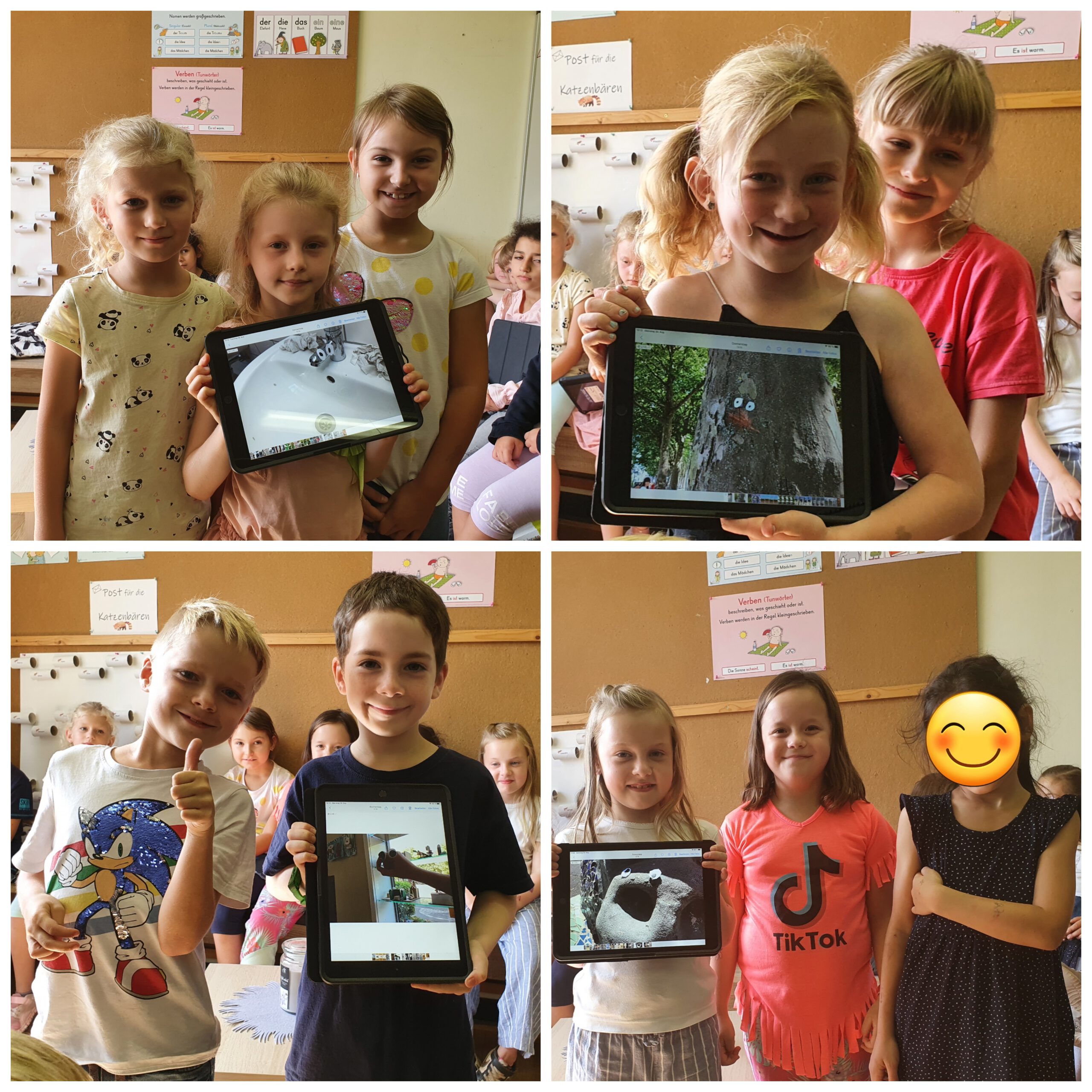 Wir haben die heißen Tage im August genutzt und den Kunstunterricht nach draußen verlegt. In Kleingruppen ging es mit gebastelten Augen und einem iPad auf eine ganz besondere Mission: Gegenständen auf dem Schulhof und in der Klasse sollten Gesichter verliehen werden. Die Ergebnisse wurden fotografiert und anschließend in der Klasse vorgestellt.