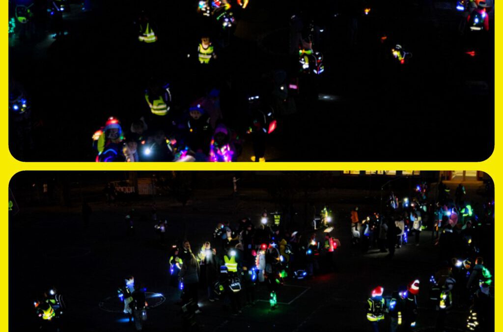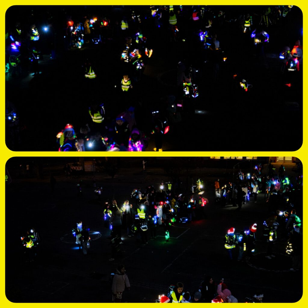 Die Kinder kamen hell erleuchtet zur Schule – mit Reflektoren, Warnwesten, Taschenlampen, Lichterketten, Leuchtstäbchen und vielen weiteren kreativen Ideen. Dafür möchten wir uns herzlich bei allen Eltern bedanken.